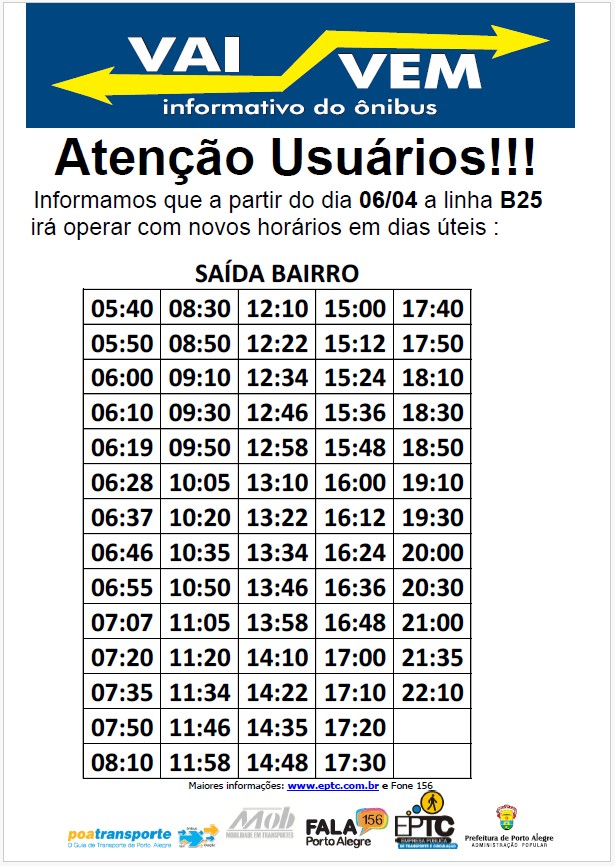 Informamos que a partir do dia 06/04 a linha B25 irá operar com novos horários em dias úteis: